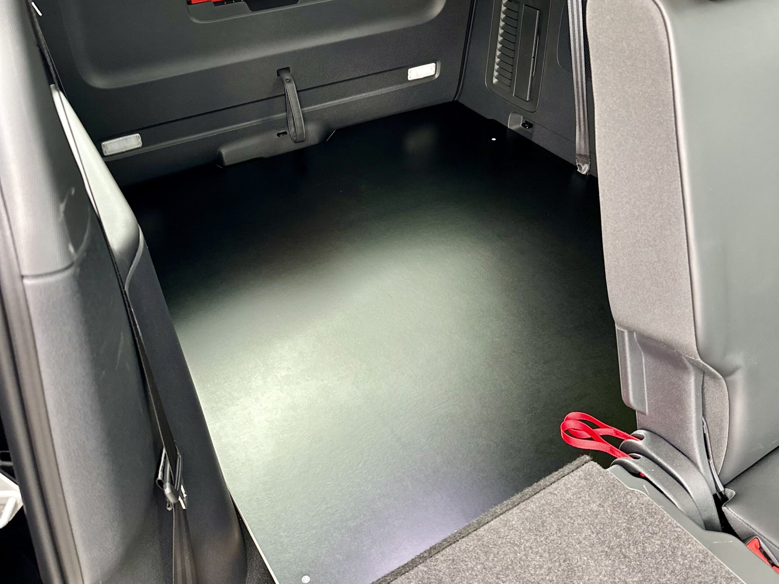 El vehículo no tiene un suelo de carga nivelado en su estado original. Los anclajes de los asientos y el escalón en el suelo hacia el habitáculo hacen casi imposible colocar una CampingBox.