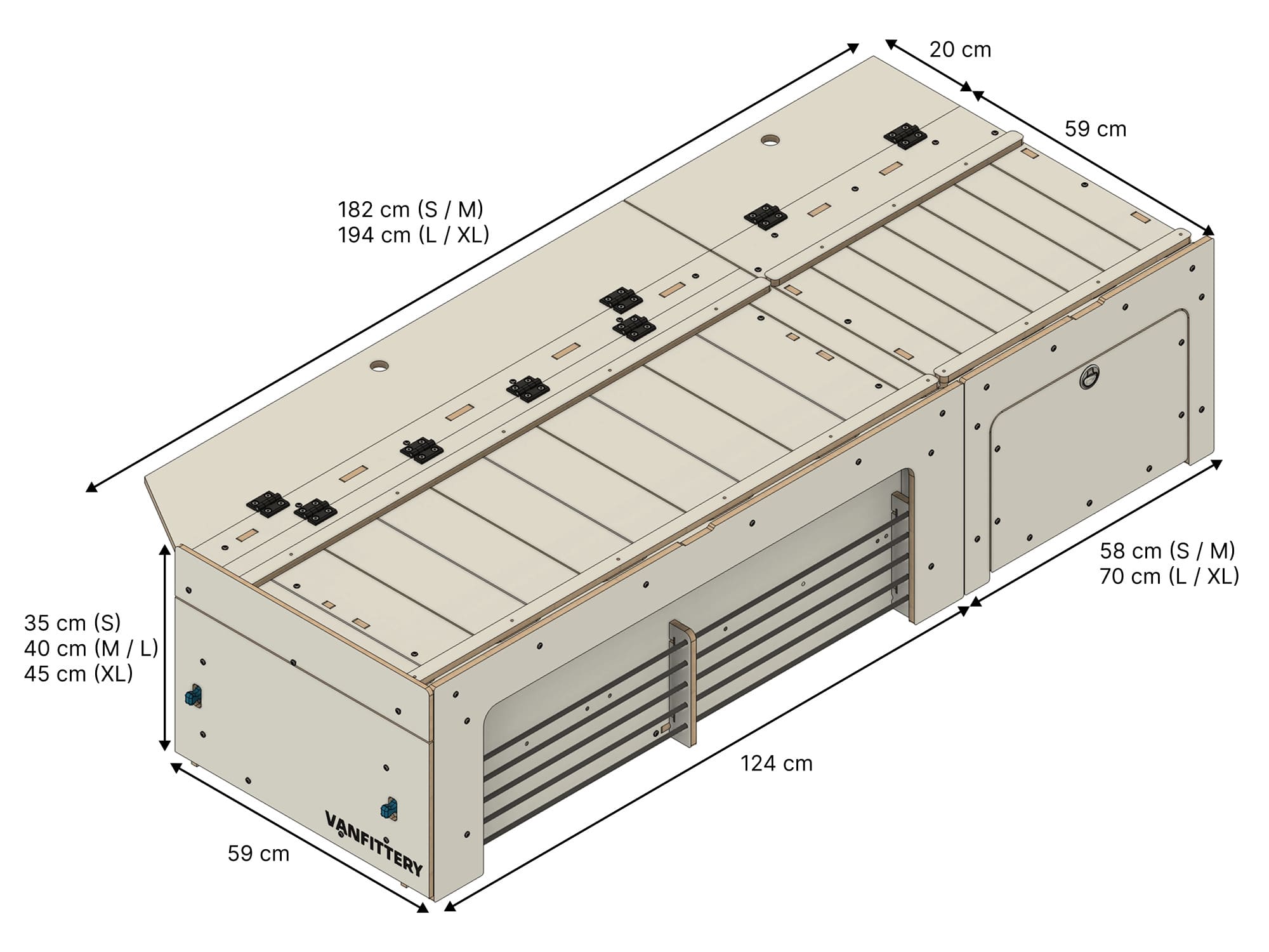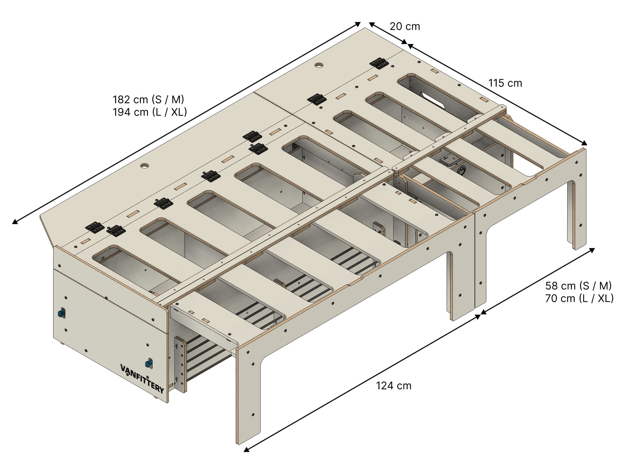 Le système de lit à extension transversale permet un concept d'espace intéressant avec beaucoup de place dans le tunnel central. Le lit s'adapte à presque tous les monospaces de la taille d'une camionnette (plus d'informations dans la FAQ).