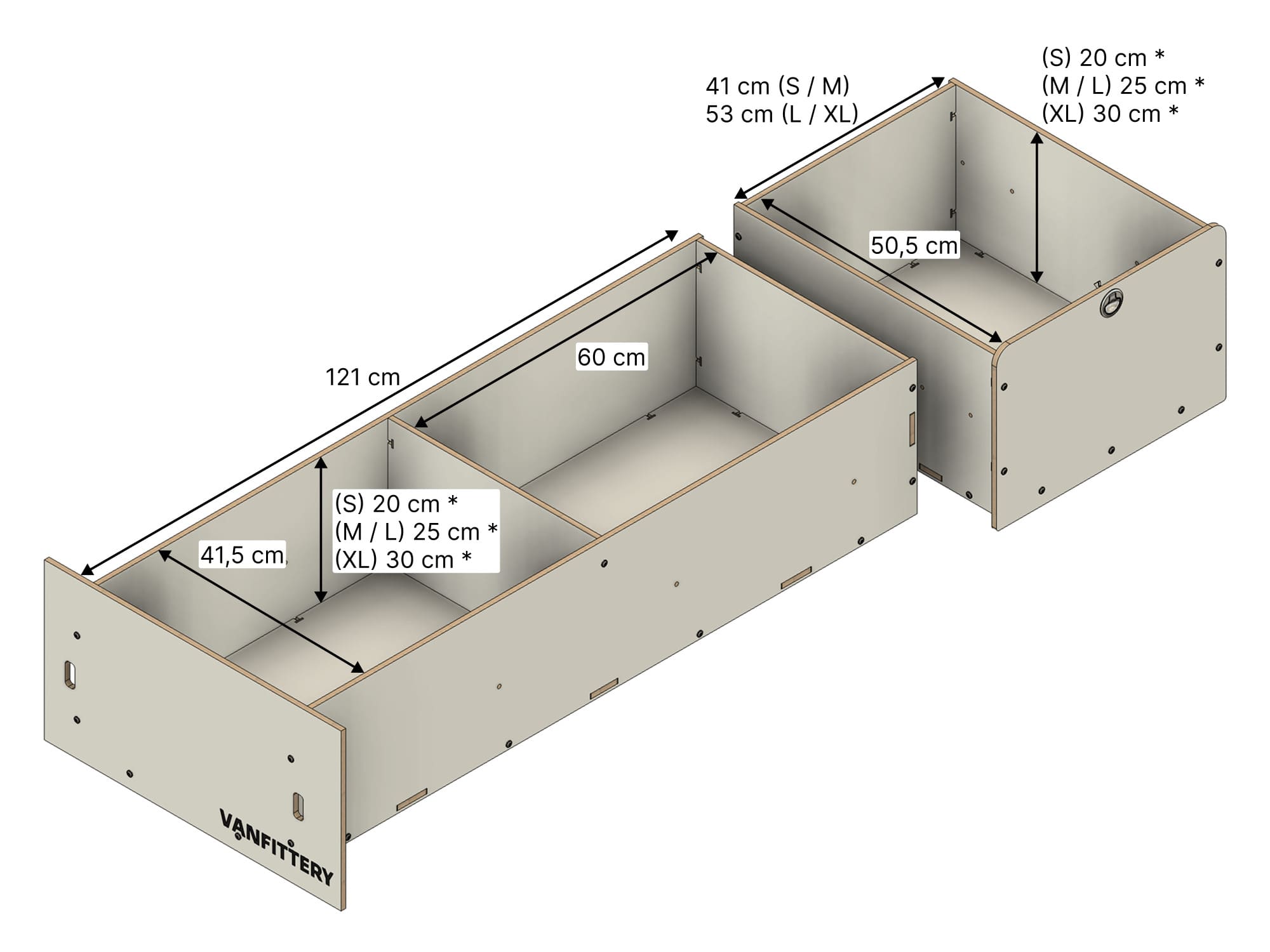 Das Bettsystem Querauszug ist in vier Größen erhältlich. Je höher der Lattenrost, desto mehr Stauraum bietet das Bettsystem. Die nutzbare Höhe der Schubladen ist 1,5 cm höher als der Schub.