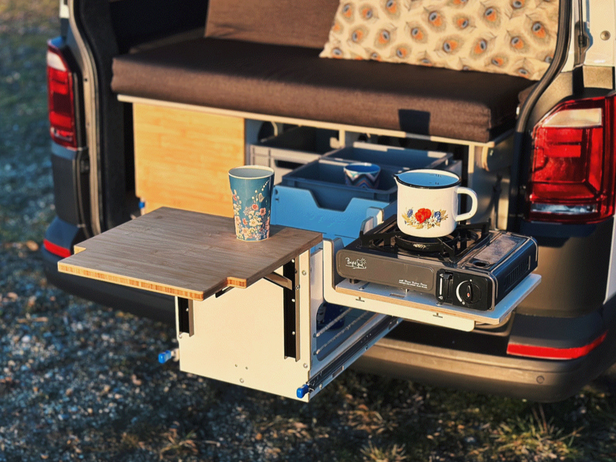 Con il supporto per il fornello, l'estraibile posteriore può essere trasformato in una vera e propria cucina posteriore. Ad esempio, può essere abbinato a un box refrigerante per compressori e al tavolo sospeso.