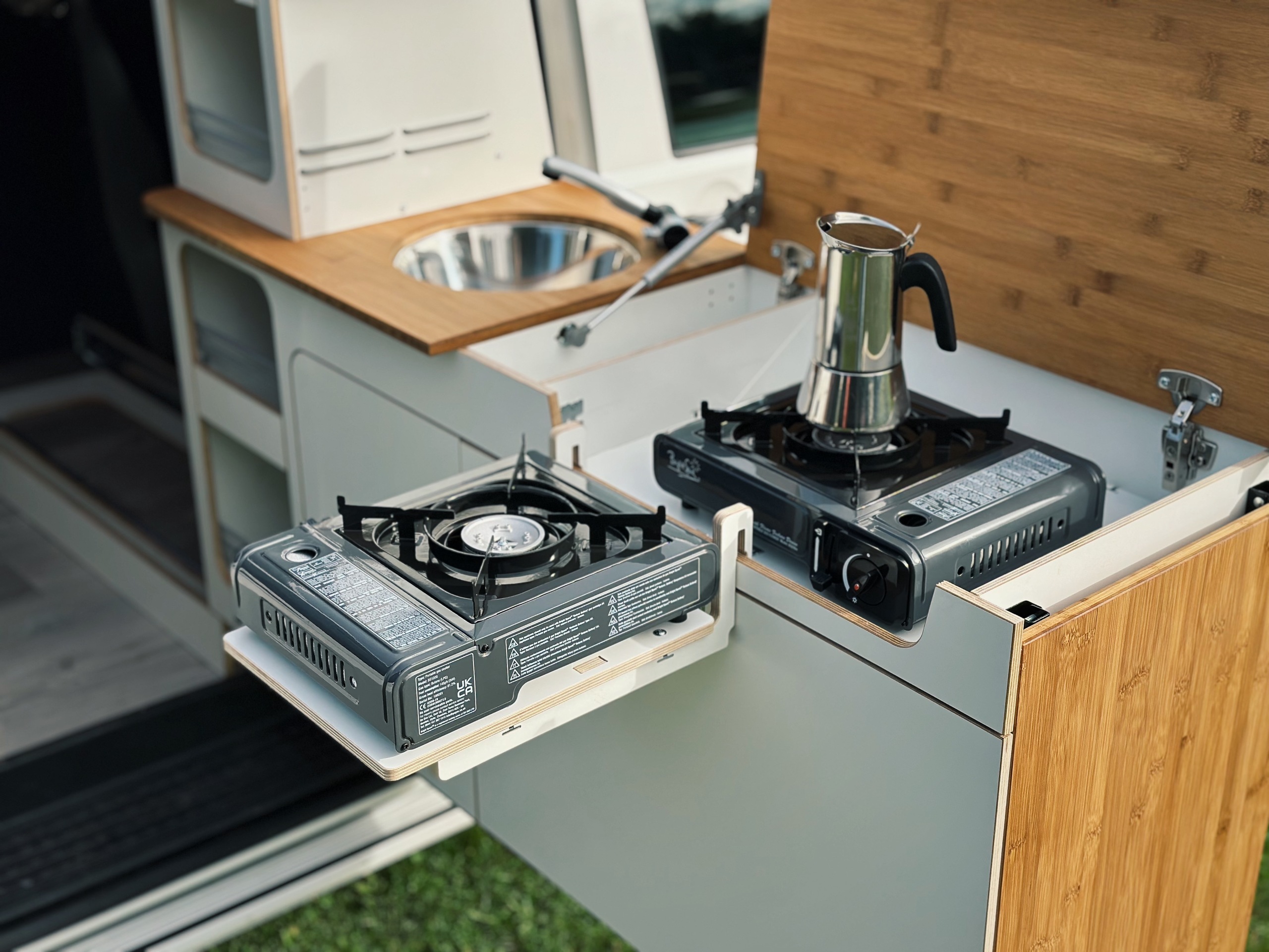 Il fornello a gas opzionale, incluso il supporto, può essere fissato praticamente ovunque. La staffa è stata progettata in modo tale da essere fissata in modo sicuro e stabile su ciascuno dei nostri moduli grazie allo spessore uniforme del materiale.